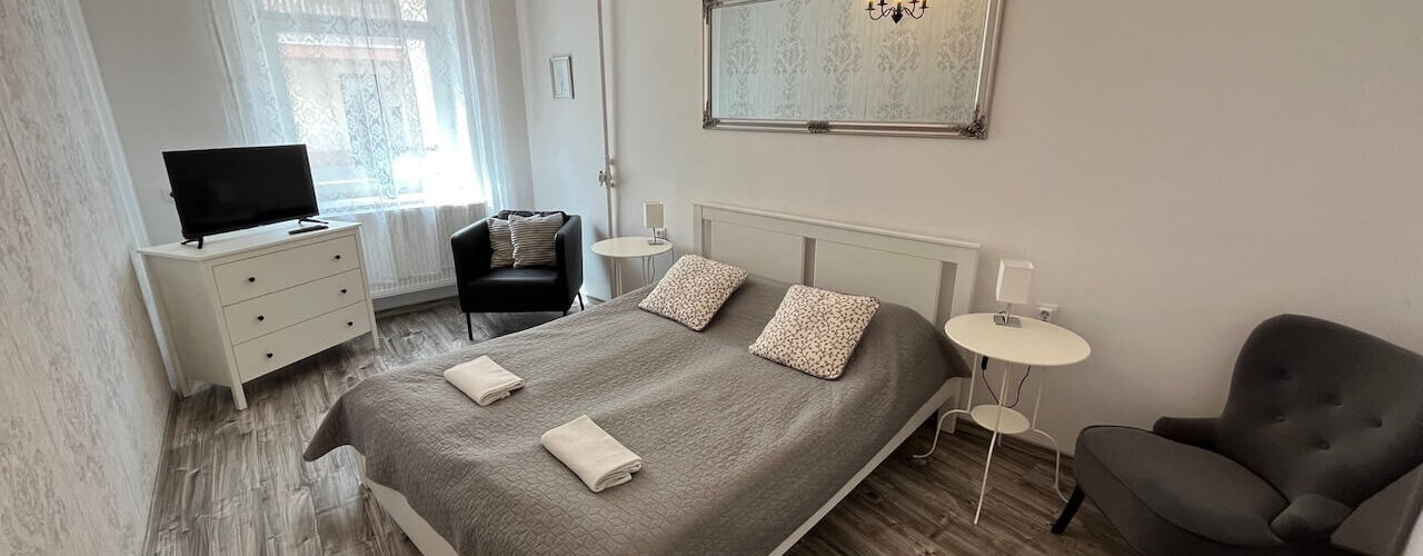 40 m2-es 2 légterű földszinti apartman, maximum 4 felnőtt számára fürdőszobával, konyhasarokkal és zuhanyzóval